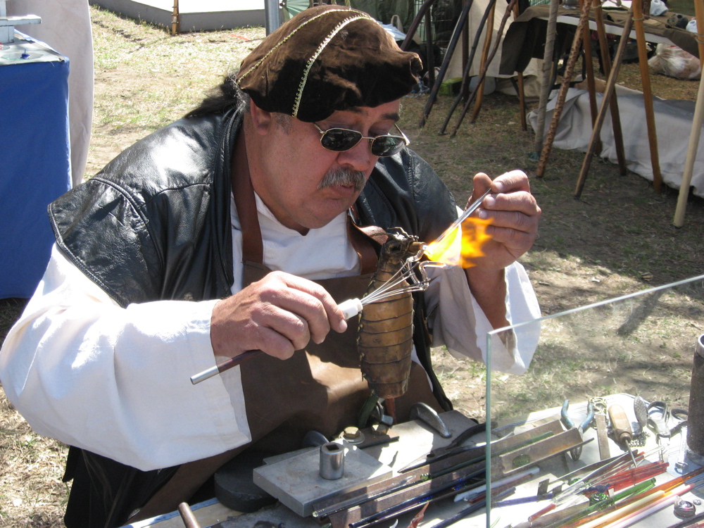 An artisan making glass jewelry and figurines. I loved all the great artisans there. This fellow was in merchants row with a booth selling his crafts. But there were other artisans there as well, in the SCA Dell and the blacksmiths too. Notice his heat source is a dragon's head.