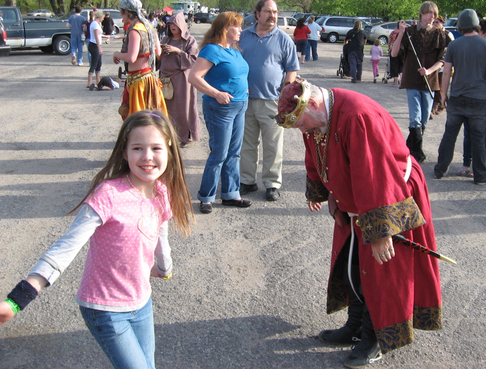 Young Holly Detrick dances with His Majesty, The King, at the close of the festival on Saturday, April 16. The King bows to his partner and declares, "She danced my spurs off." Sure enough, the spur on his right boot had come loose. Holly had a great time!