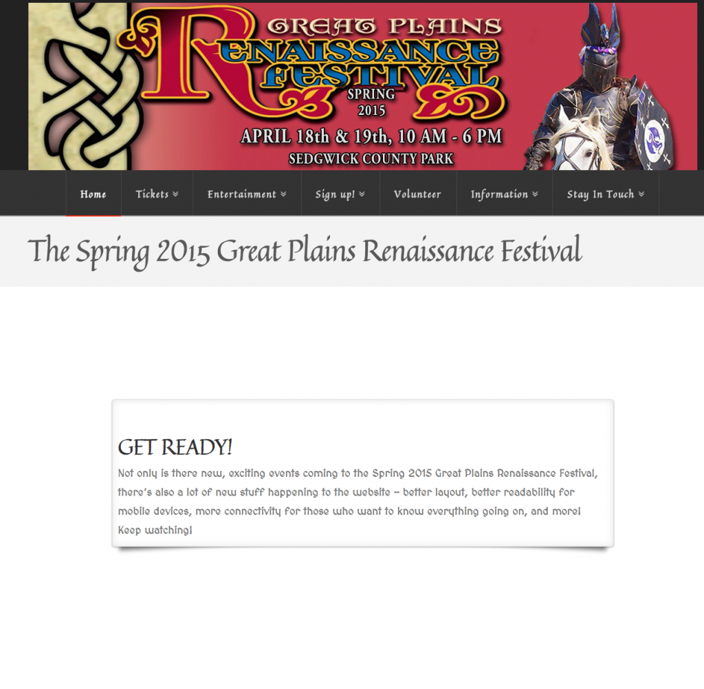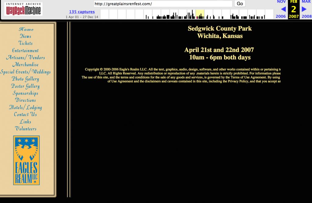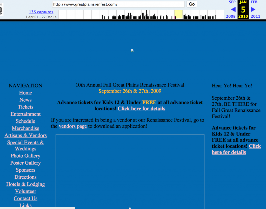 Hi, you probably don’t know me, but I’m the guy who’s behind the scenes, updating the Great Plains Renaissance Festival website, and have been since mid-2009. The site it’s self started way back in 2001 (or, at least that’s as far back as The Internet Archive’s WayBack machine goes – I remember going to the Ren Fests way back when, even the Newman Renaissance Festival back when it was still at thing, but I don’t remember much about the site back then.)